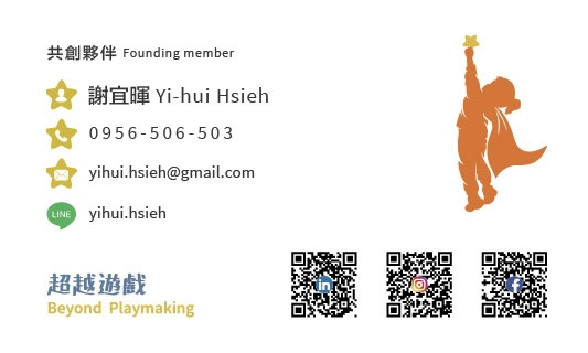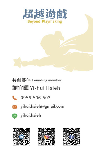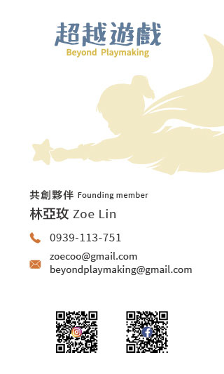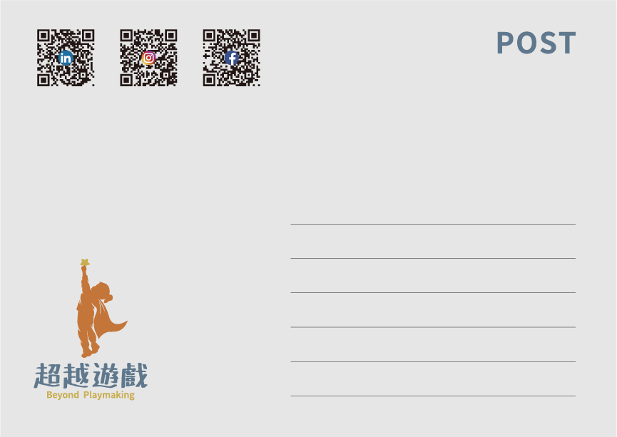 「超越遊戲」是由一群因為養育孩子在兒童友善領域深耕近十年的兒童遊戲專業者(媽媽)組成,成員長期投入公園改造、參與式遊戲空間設計、遊戲權益倡議、國際事務交流,以及「兒少友善 (Child Friendliness)」相關議題的研究與實踐推動。組織成員致力於透過遊戲改造公共空間與社會文化,為兒童與青少年創造更多元共融的生活環境。以Dr. Landreth 名言:「鳥飛,魚游,孩子遊戲。」為核心理念,深信遊戲是兒童的天性,能讓他們在最自由、最具創造力的狀態中成長。品牌識別視覺設計由齊力團隊發想與執行,以一位披著披風、向上飛翔的孩童輪廓作為品牌標誌,象徵「超越」與「遊戲」的精神,同時呼應品牌口號:「遊戲,讓孩子飛翔」。這一形象不僅展現遊戲帶給孩子的活力與力量,也傳達我們對打造更友善兒童社會的願景。